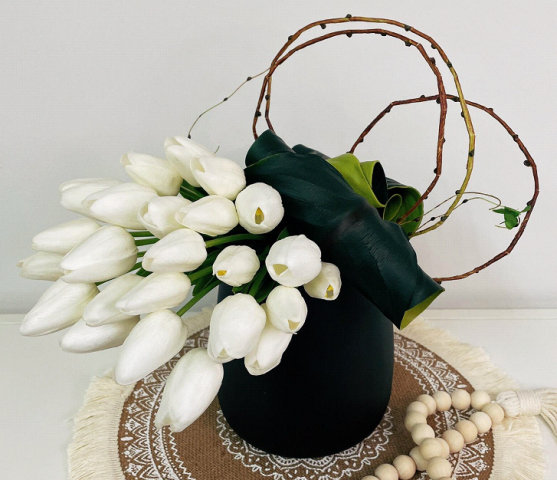 TULIPS & GREENERY IN BLACK POT
