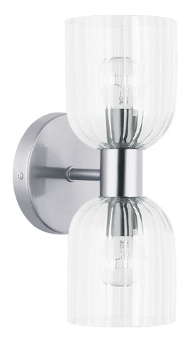 2 LIGHT INCANDESCENT VANITY FIXTURE WITH DECORATIVE RIBBED GLASS SHADES POLISHED CHROME, WHITE GLASS