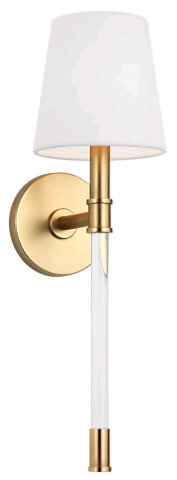 SCONCE WITH CLEAR STEM BURNISHED BRASS, WHITE LINEN SHADE