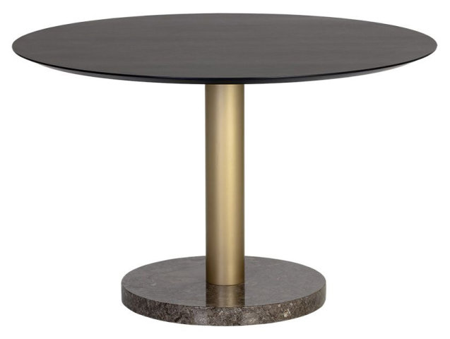 48IN ROUND WOODEN TOP DINING TABLE W/METAL ACCENT MARBLE BASE GREY WOOD TOP BRUSHED GOLD/GREY MARBLE BASE