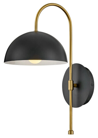 INDUSTRIAL SCONCE WITH SLEEK DOME AND TALL ARCHED ARM BLACK, BRASS ACCENTS, WHITE INTERIOR