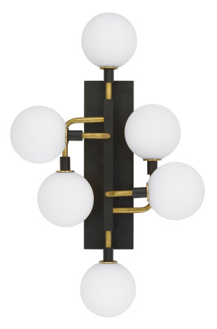6 LIGHT LINEAR WALL SCONCE WITH GLASS GLOBES BLACK WITH BRASS ACCENTS - WHITE OPAL GLASS GLOBES